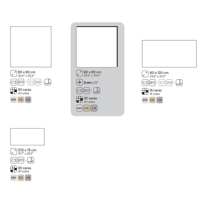 90 x 90 cm Farbe Moon – Verfügbar C3 OUT Rutschfest, C1 IN für Innenbereiche – Stückzahl pro Karton 2 = 1,62 m² – Palette 48,6 m²
