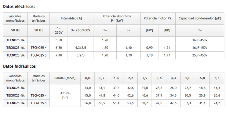 Aspiración máxima (m): 9 ,Temperatura del líquido (ºC): Max: 40