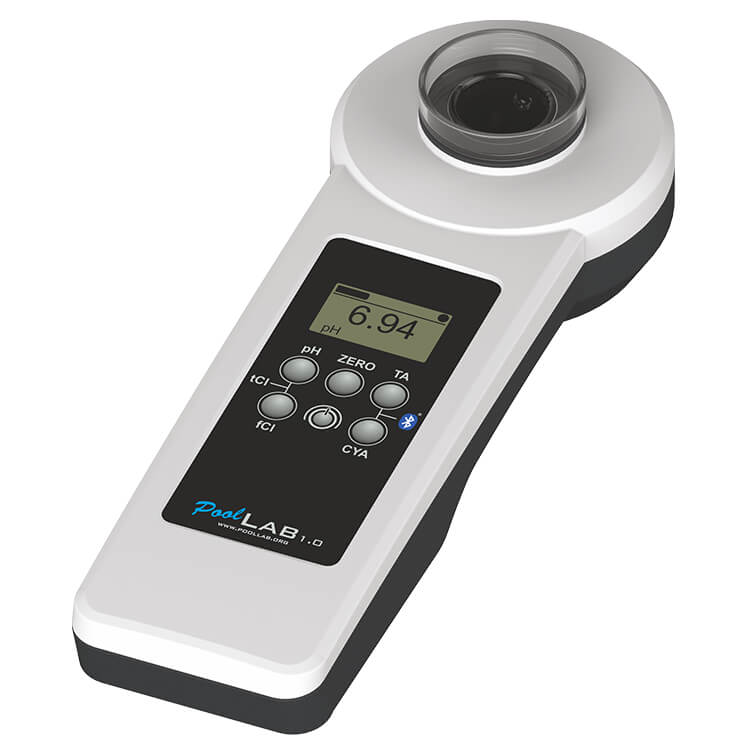 El fotómetro doméstico PoolLAB lleva una cubeta incorporada pero intercambiable que permite un muestreo rápido del agua simplemente sumergiendo el aparato en la piscina. Lleva seis botones que permiten el acceso instantáneo a los parámetros siguientes: pH, cloro (libre, combinado, total), alcalinidad, ácido cianúrico, oxígeno activo, bromo, dióxido de cloro, ozono y peróxido de hidrógeno. Conexión inalámbrica Bluetooth, conexión a software para imprimir los resultados y realizar cálculos.