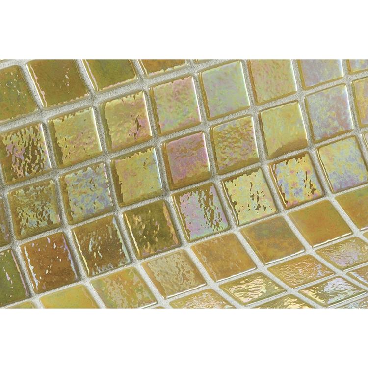 A borostyánszínű irizáló üvegmozaik kifejezetten belső terek, uszodák, fürdők, szaunák és wellness-részlegek burkolására tervezett termék.