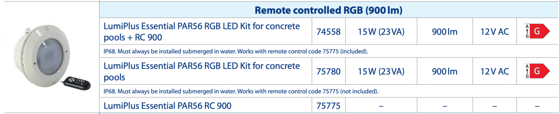 Lumiplus Essential PAR56 proiector LED încastrat de Astralpool pentru a vă ilumina piscina. Lumină RGB cu un flux luminos de 900 de lumeni pentru piscine din beton și cu opțiune de telecomandă RC 900.
