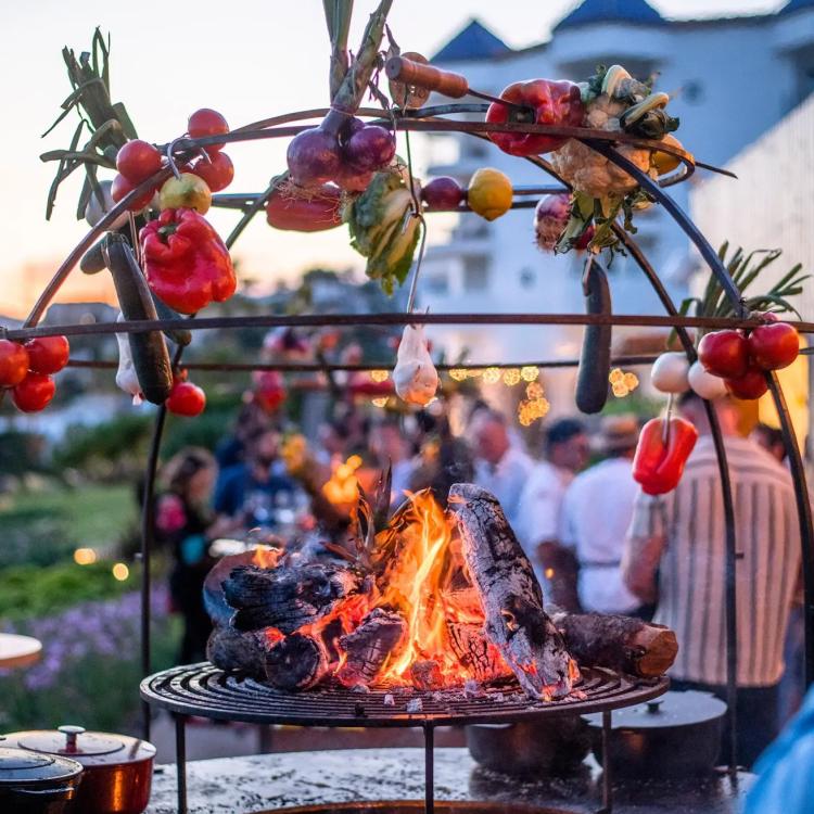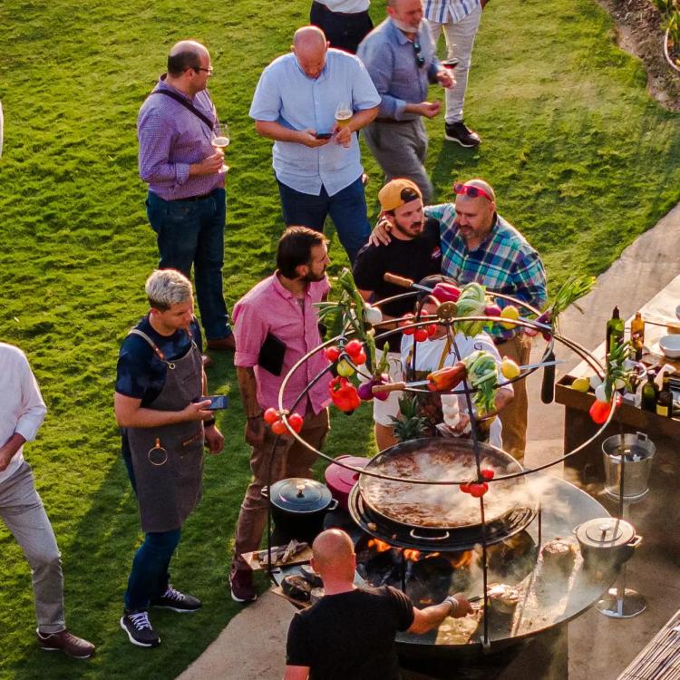 The heat from the fire slowly cooks the ingredients, from meat and fish to fruit and vegetables. As the cage is attached to the outer edge of the plate, the cooking surface remains free for preparing other dishes. Ingredients can be hung from the beams using skewers and S-shaped hooks.