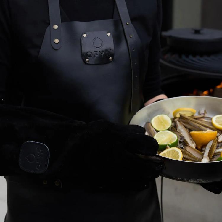 The OFYR leather apron is made from high-quality leather and features the logo and an adjustable belt. This apron is not only stylish, but also offers excellent protection from the heat of OFYR cooking units.