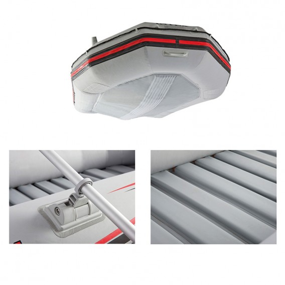 The floor is made of extra strong extruded laminated plastic to improve stability and resistance. Grey boat with red and black lines.