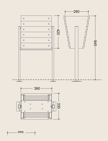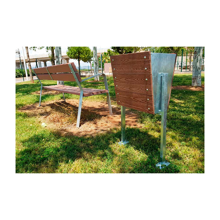 * Mobipark's used technical wood is composed of natural fiber and thermoplastic polymer, both from recycling. Ecological benefits: use of recycling and less felling of trees. It produces no splinters or cracks, is resistant against insects, carcoma and termites, weatherproof and with 5 times longer durability than natural wood. Also, the hot galvanization of the structure makes this furniture maintenance-free.