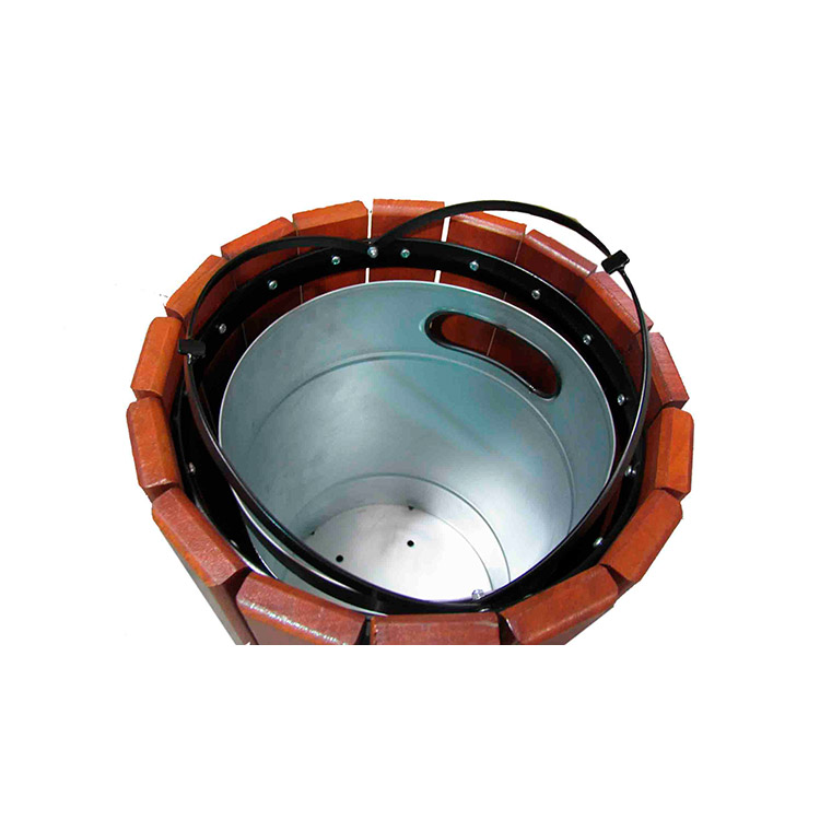 Cylindrical wood bin with metal structure inside, formed by tropical wooden slats finished with a double layer of fungicide protective lasur, insecticide and water-repellent teak.