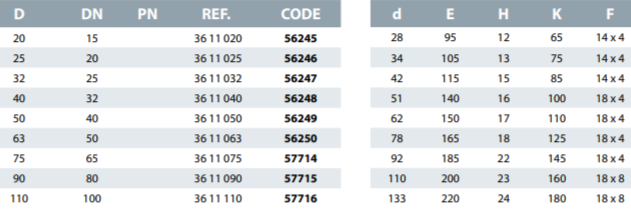 Dimensions: glue fittings from D16 to D110 and threaded fittings from ¼" to 4".