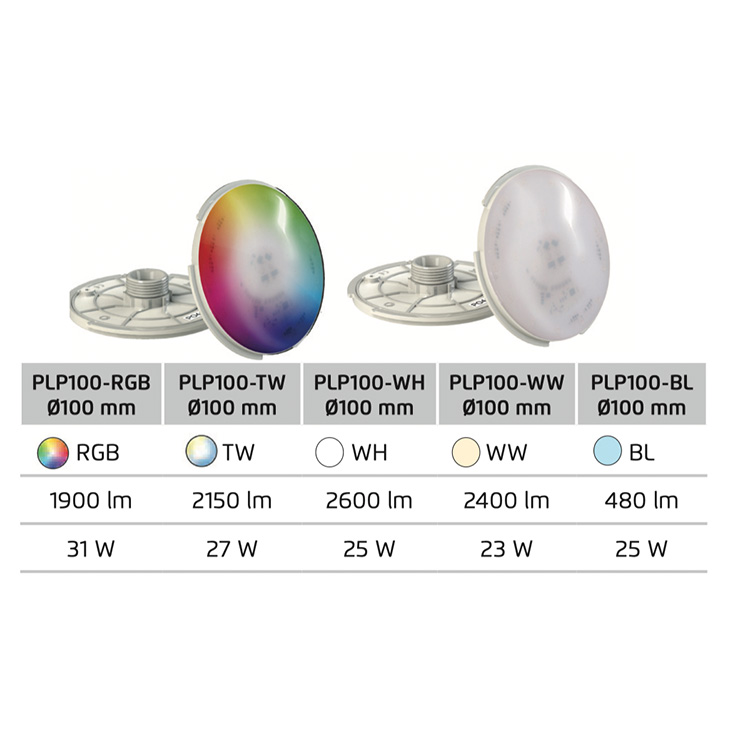 The 170 mm version is compatible with PAR 56 niches. Its lifespan is more than 50,000 hours. Its niche, NoAirTM resin filler prevents water from seeping into the bulb. Its high quality polymers make it compatible with saline electrolysis. Removable 4-metre rubber Cable included. White color and 11 RGB color modes can be programmed.