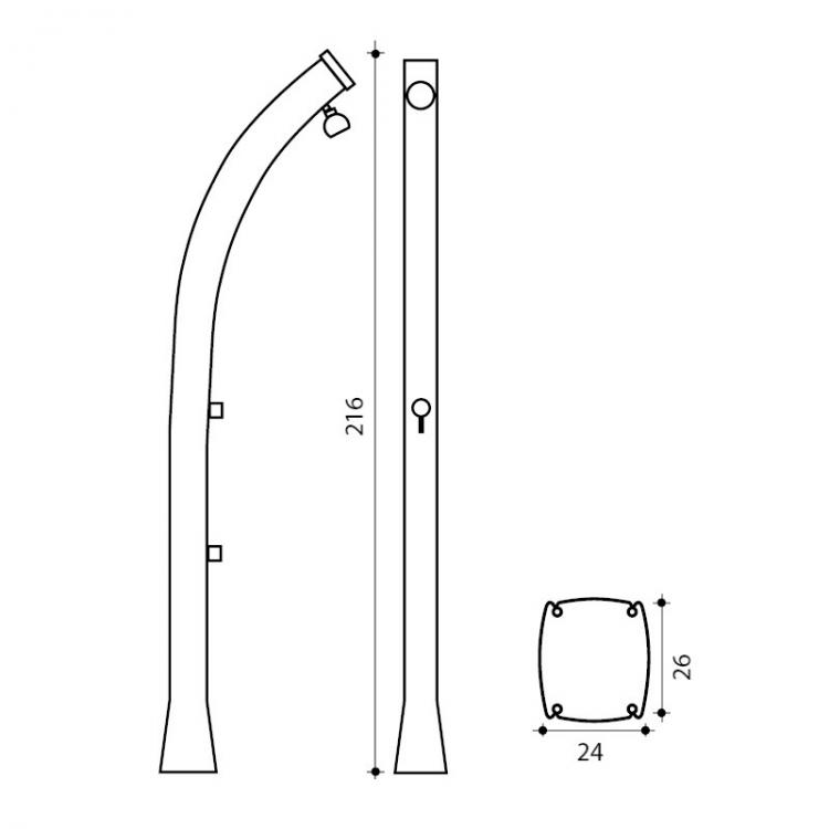 It features a single-line mixing valve, a foot-operated drain valve and a 28-litre water tank that is heated only by the heat of the sun, making it a 100% sustainable shower. The flared base provides stability and easy installation on a garden hose.