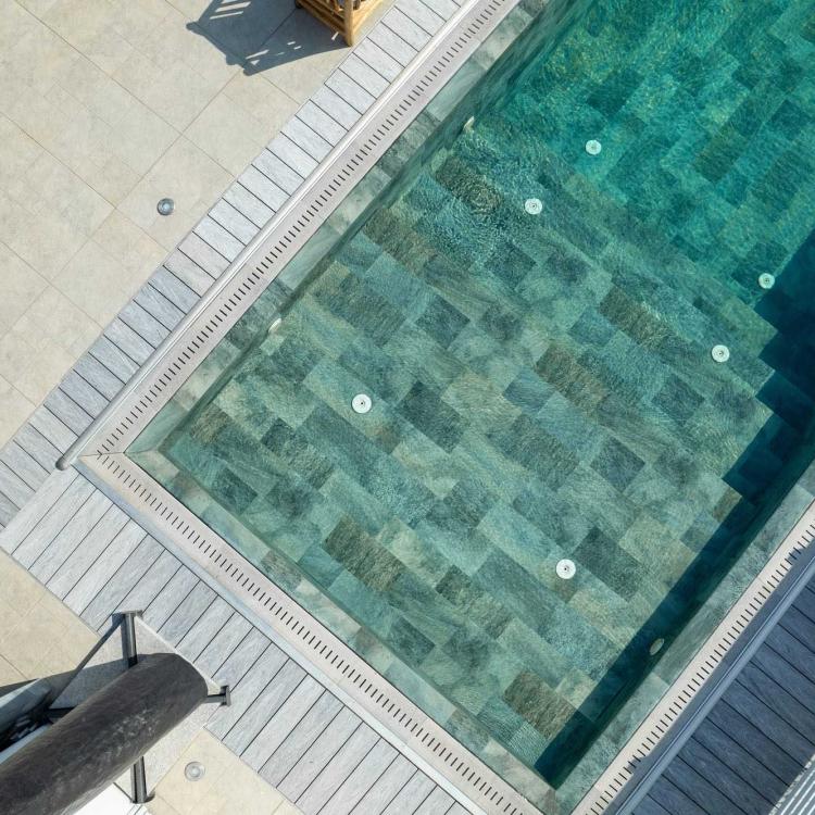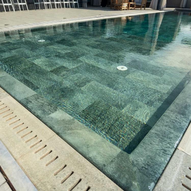 The Emerald design captures the natural beauty of this precious gemstone, with deep green tones and shimmering textures that reflect the richness of nature. Crafted with stone-inspired 40×20 cm tiles, this design transforms your pool into a luxurious jewel, radiating elegance and vitality with every glance at the water.